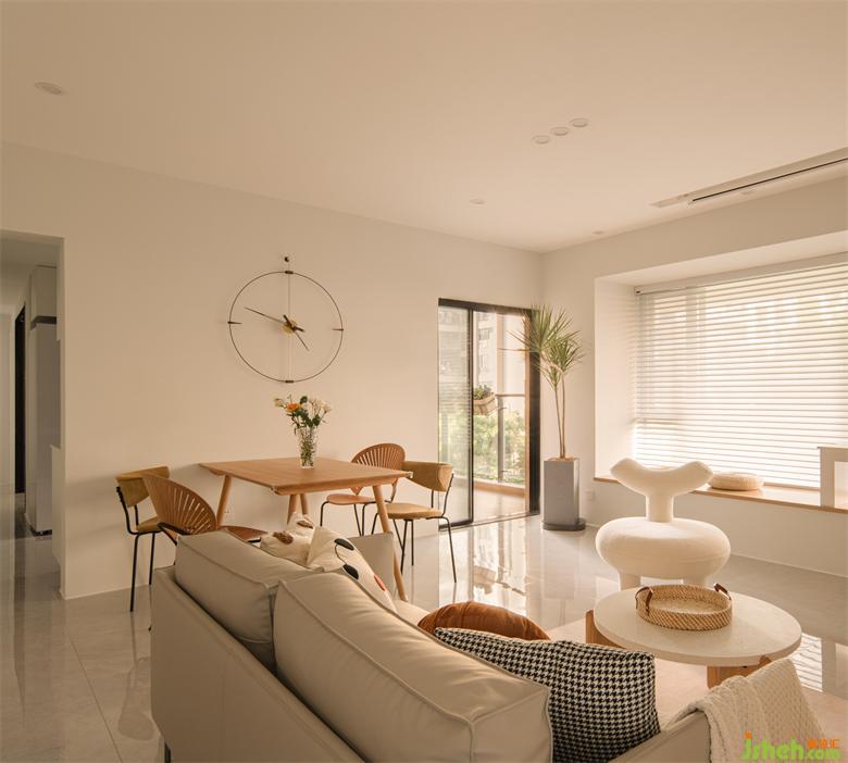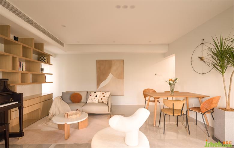 保證公共空間視野的開闊和延續(xù),餐廳的收納移至輕食區(qū),極簡nomon掛鐘搭配原木餐桌椅,營造簡單溫馨用餐氛圍。