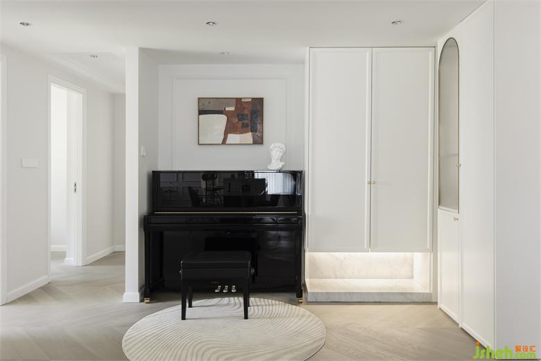 由白色收納結(jié)構(gòu)圍合的多功能區(qū)是小朋友練琴和玩耍的地方,半高低矮的收納空間引導(dǎo)小朋友養(yǎng)成隨手收納和整理的好習(xí)慣。