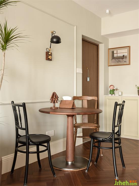 多立克圓桌與黑色索耐特14號椅,融合現(xiàn)代與古典的藝術搭配延續(xù)時尚與懷舊格調(diào),圍合得布置使空間間隔緊湊而有余,滿足日常一家三口或輕食或休閑的多樣化就餐場景。