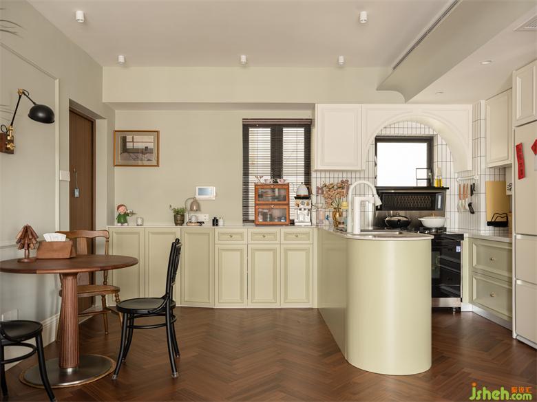 全屋以胡桃木與淺綠色兩種源自森林里的顏色為主色調(diào),碰撞出原始又迷人的復古質(zhì)感,點綴金屬配飾營造輕奢復古的精致浪漫。
