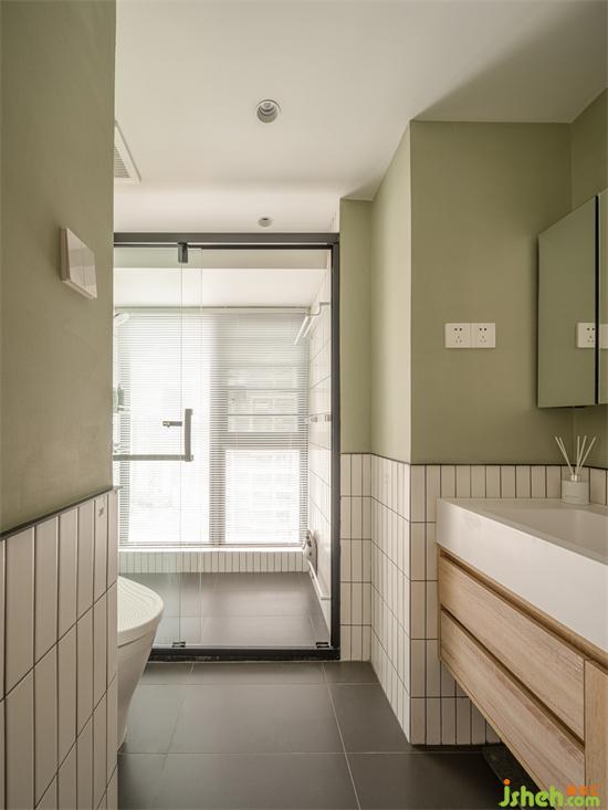 更換落地窗搭配百葉簾引入通透光影至浴室空間,小方磚與綠色墻面延續(xù)清新基調(diào)。