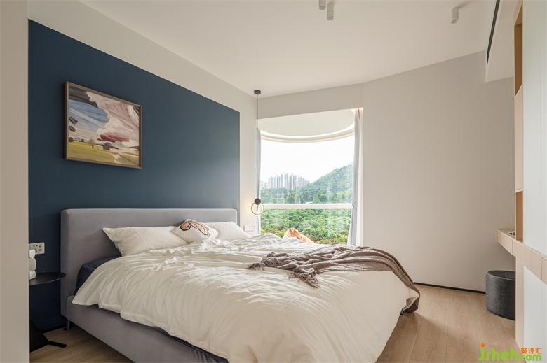 縮小主衛(wèi)開間后增大了過道寬度,把收納和梳妝區(qū)留置在床尾,山居歲月家裝設計雙人床居中布置釋放窗外宜人景色,呈現(xiàn)開闊舒適的睡眠休息區(qū)。