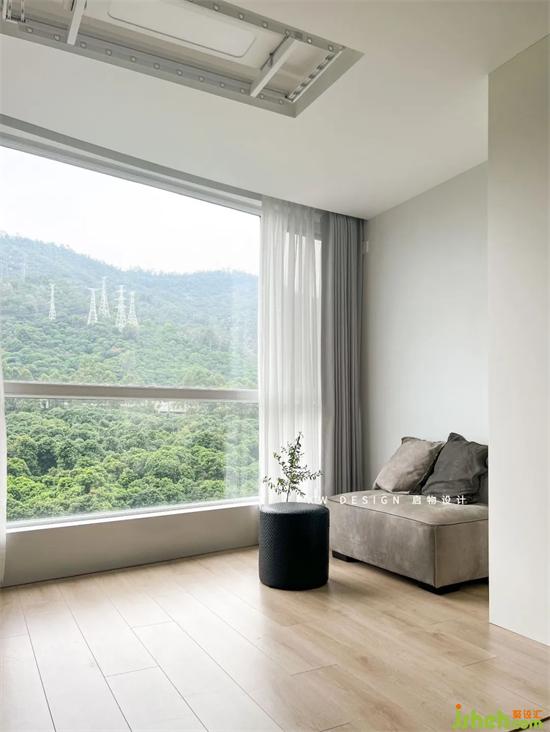 陽臺另一面較寬,預留一組收納高柜,剩余1.8m多的大開間,搬來客廳待客用的豆腐塊沙發(fā)和矮凳,就是一處觀景休閑臺。山居歲月家裝設計挪開座椅的開闊場地,也能做親子互動或者瑜伽健身之地。