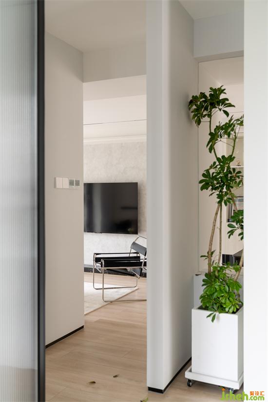 為了不浪費過道空間,把公衛(wèi)的干區(qū)外置,還能做超大體量的收納補充,與外空間的過渡連接處預留綠植端景,為功能立面增添生機和活力。