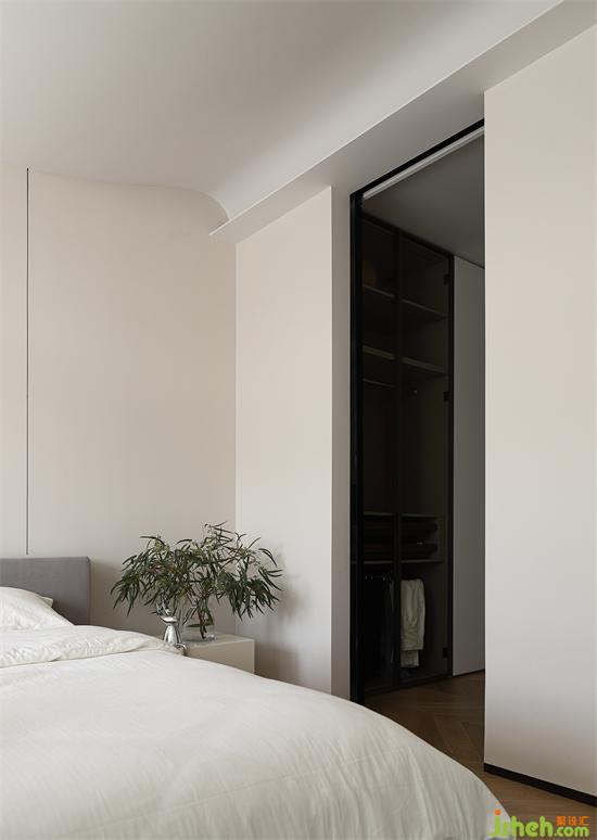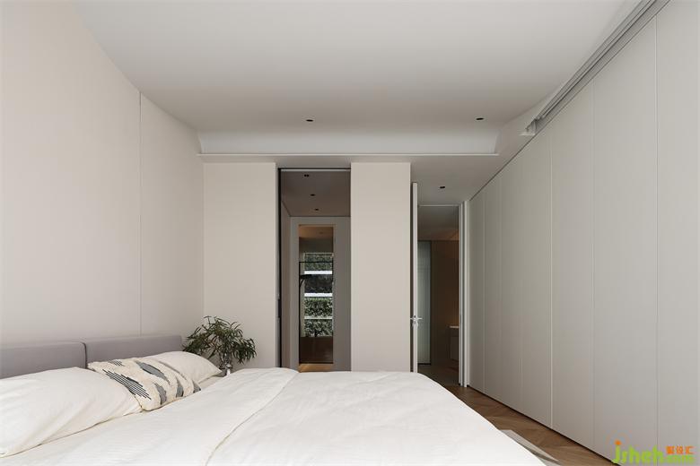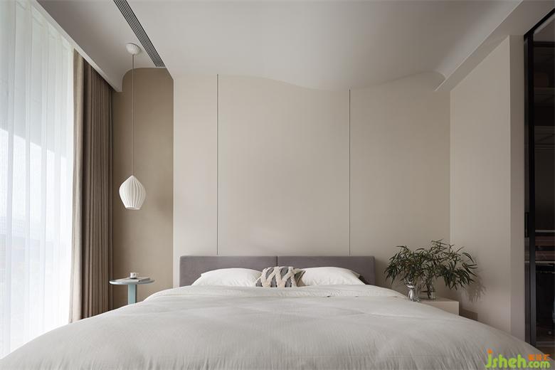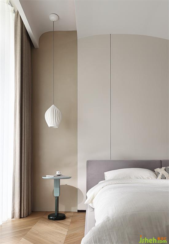 延續(xù)純粹與極簡(jiǎn),由微水泥與藝術(shù)涂料裝飾床頭背景,色感清甜,既有侘寂的自然素雅又有奶油般的溫柔精致。