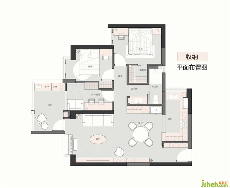 1.原格局過(guò)道偏空間右側(cè)壓縮了餐廳、衛(wèi)生間以及主臥空間,縮短沙發(fā)背景之后,使通往臥室的過(guò)道處在空間中軸線上,同時(shí)釋放有輕食臺(tái)的餐廳、三分離衛(wèi)生間、帶衣帽間的主臥、可三面下床有獨(dú)立書(shū)桌和收納的次臥,以及靈活的多功能房。