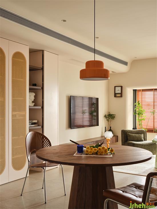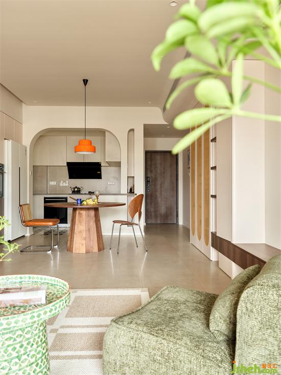 空間上結(jié)合小婉子對(duì)風(fēng)格色彩的偏好,弧形結(jié)構(gòu)搭配奶油色作溫柔耐看的硬裝基底,古著木色與清新調(diào)色色融于其中,瀚海東岸家裝設(shè)計(jì)平衡現(xiàn)代北歐與復(fù)古,打造自然樸實(shí)且輕松的中性空間氛圍。
