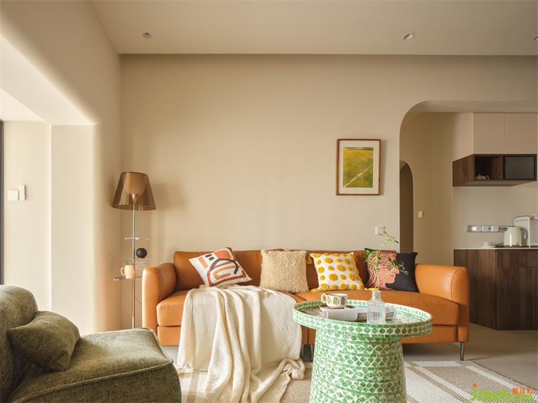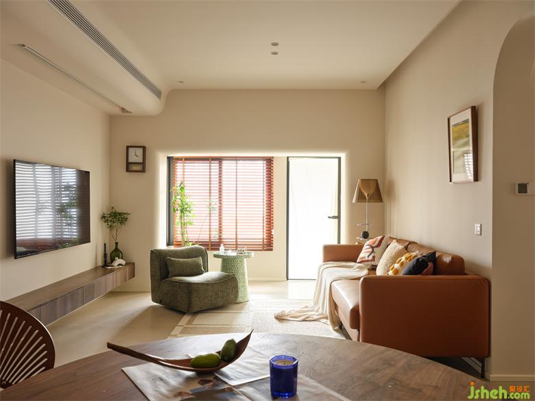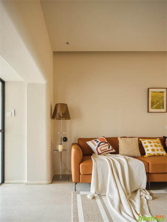 壓縮的沙發(fā)背景仍有三米寬,瀚海東岸家裝設(shè)計(jì)自帶復(fù)古色感的皮料沙發(fā)搭配書(shū)架落地?zé)魹橄矏?ài)閱讀的屋主增添休閑閱讀角。