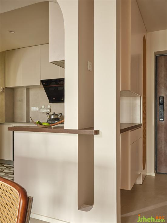 玄關(guān)柜與廚房做了結(jié)構(gòu)穿插自然銜接過(guò)渡,瀚海東岸家裝設(shè)計(jì)滿足收納功能卻不見(jiàn)收納體量,同時(shí)鏤空的結(jié)構(gòu)為遠(yuǎn)離采光面的玄關(guān)增添自然光線。