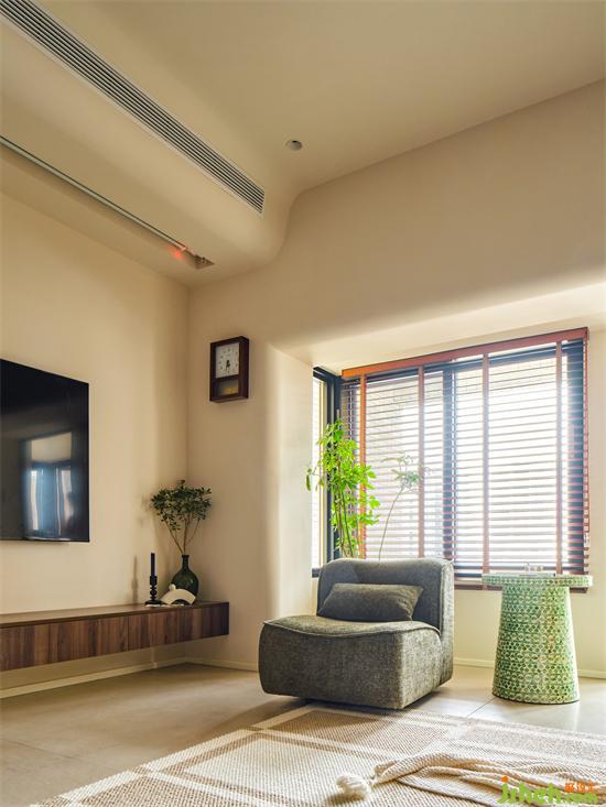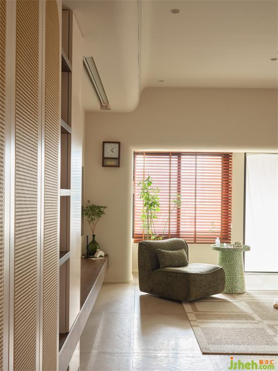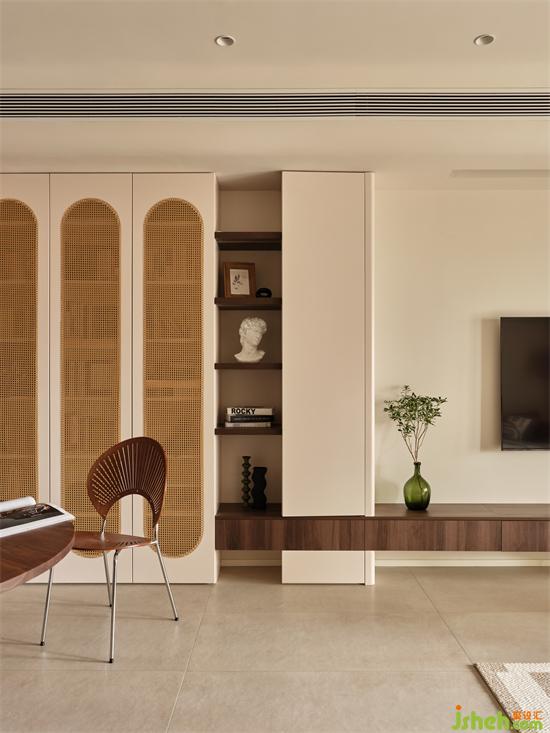 懸挑柜由電視墻延伸穿插至過道的通頂柜作休閑空間的收納補(bǔ)充,藤編柜門與開放層板架弱化收納體量,實(shí)用滿滿的同時(shí)空間兼具呼吸感。
