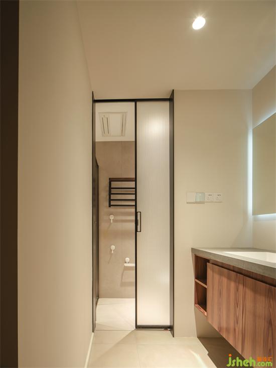 公衛(wèi)干濕分離提高使用效率,家裝設(shè)計(jì)在洗手臺(tái)另一側(cè)做薄墻嵌入收納壁龕,釋放清爽洗漱區(qū)。