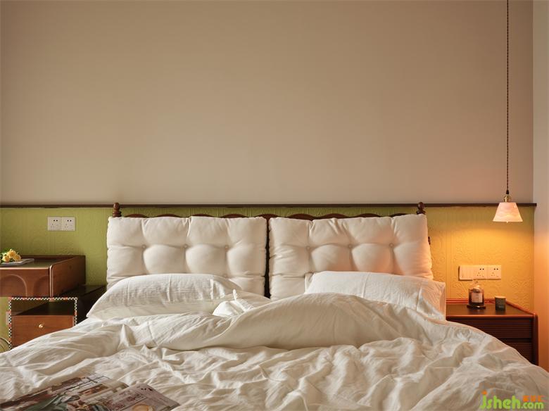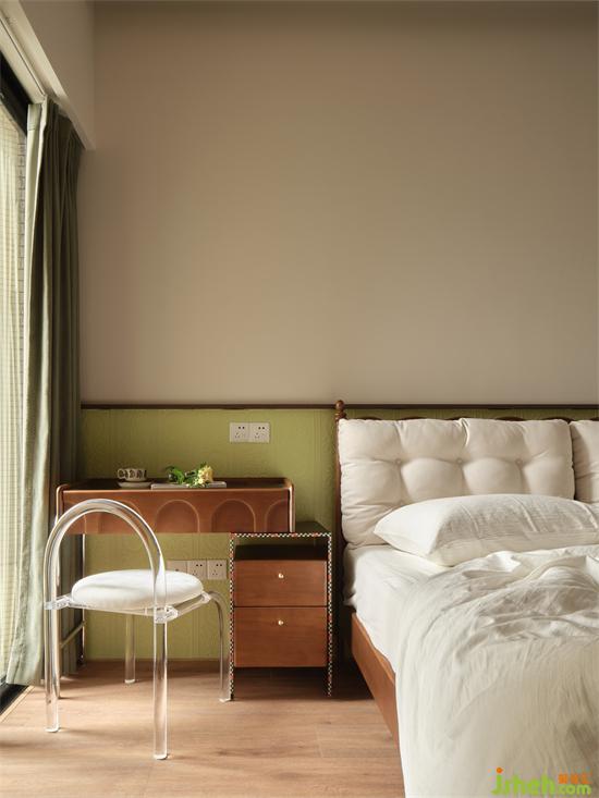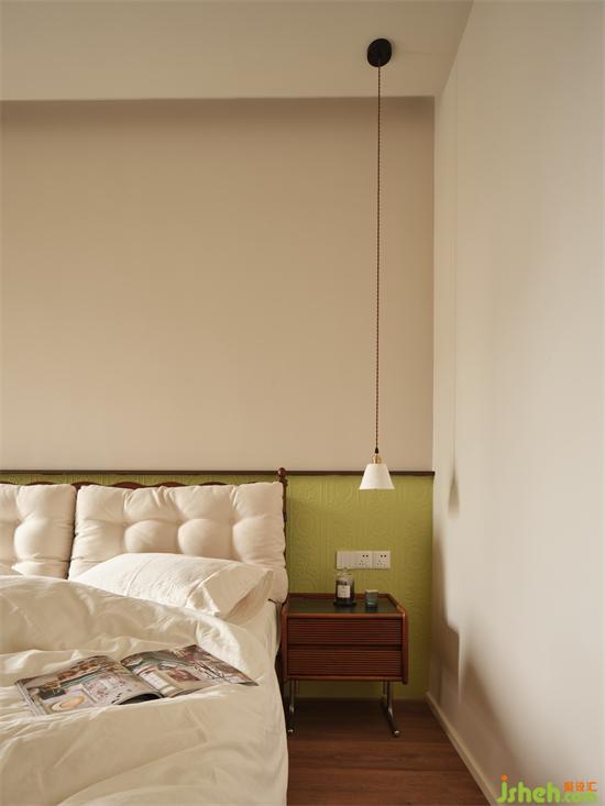 臥室床頭采用半高的淺綠色海基布作背景裝飾,瀚海東岸家裝設(shè)計(jì)古典花紋與其浮雕質(zhì)感與為奶油輕復(fù)古空間注入時(shí)尚精致家居感,清新淡雅又別具一格。