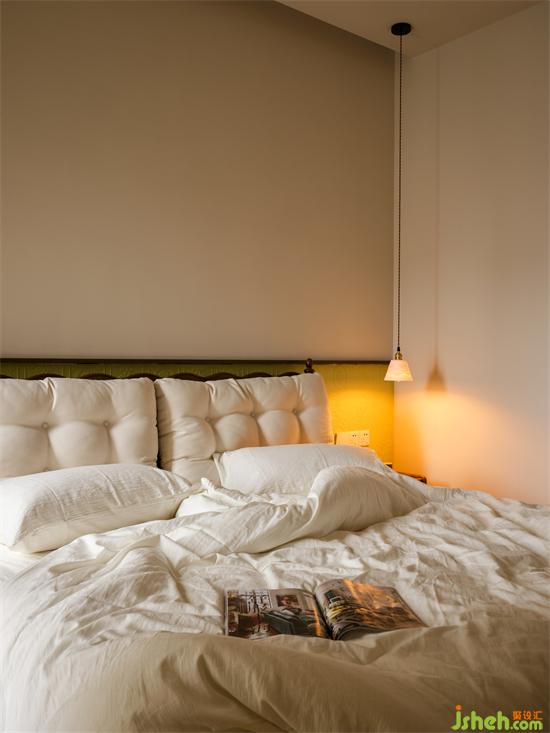 床頭陶瓷吊燈小巧精致,半透光的漸變厚度在暖黃燈源的映襯下產(chǎn)生群山疊影的層次變化,瀚海東岸家裝設(shè)計(jì)滿滿的意境和氛圍感。