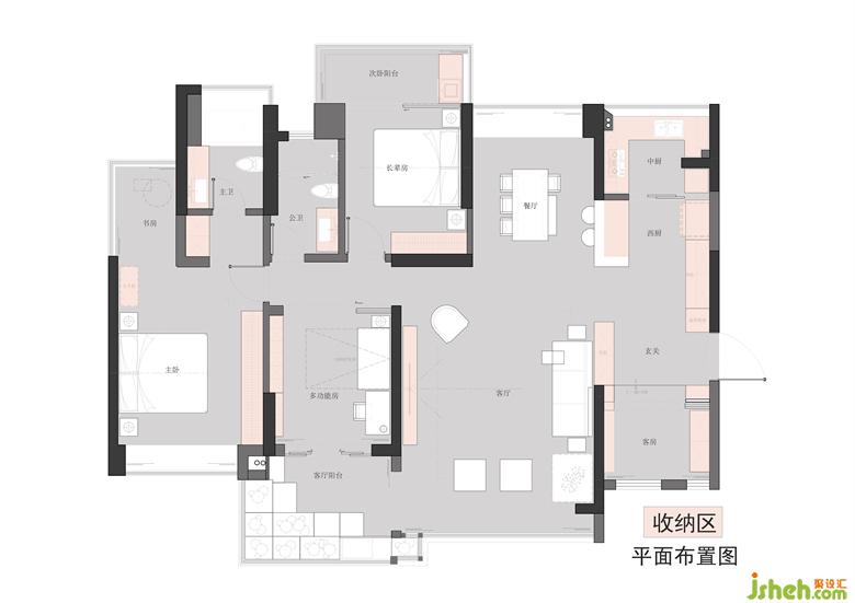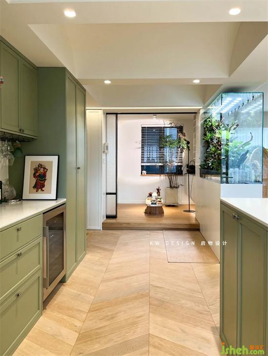 4. 進(jìn)門左邊預(yù)留鞋柜連接西廚的餐邊柜和冰箱,靠?jī)?nèi)的中廚空間預(yù)留推拉門可封閉可開(kāi)放,再由兼吧臺(tái)功能的操作島臺(tái)連接餐廳,實(shí)現(xiàn)利用率和儀式感滿滿的煙火區(qū)。