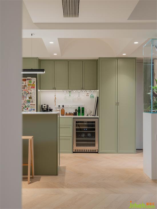 Germany對(duì)家里每樣?xùn)|西都要求細(xì)致完美,同樣作為設(shè)計(jì)師,在柜門的形體設(shè)計(jì)上,注重立體尺寸和造型層次,要求在每個(gè)單元柜之間增加兩公分的收口條以達(dá)到更豐富的立體美感。拉手也是親自挑選的拉絲古銀做舊款,和綠色柜門搭配復(fù)古精致。
