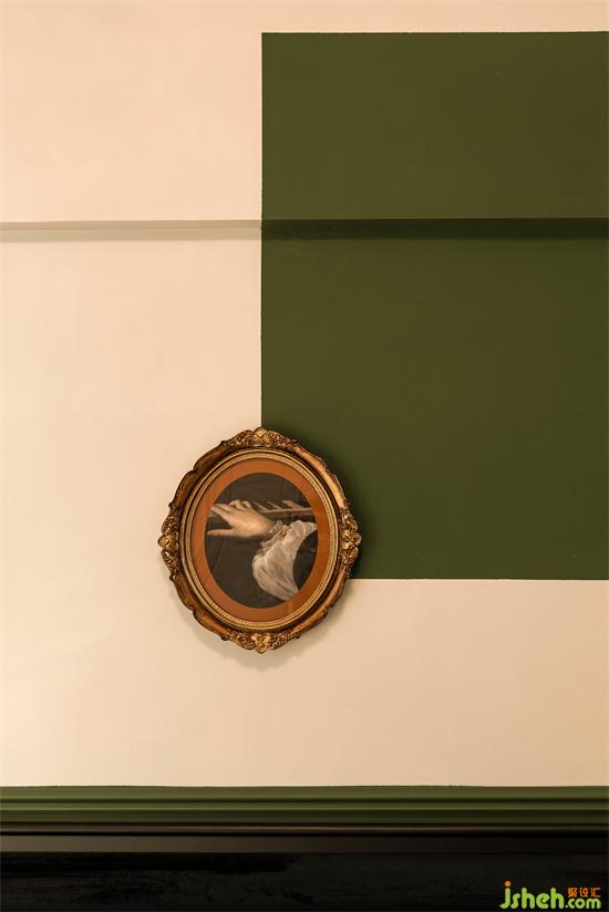 無意為之的墨綠與結構粱位形成的折角增加了塊面的層次和立體感,乳膠漆與古典油畫的搭配,動靜虛實,方圓連接,讓造型背景充滿唯美律動的高級感。