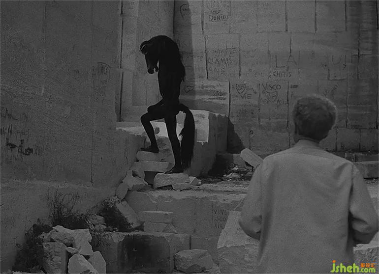 “黑色馬頭男子從臺(tái)階走下,進(jìn)入光影采石場,他的影子投射在白色墻壁上。”