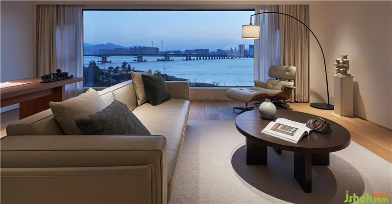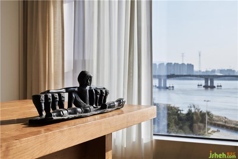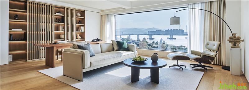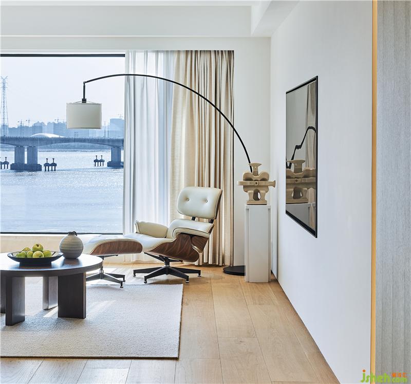 客廳和開(kāi)放式書(shū)房的大尺度落地玻璃窗設(shè)計(jì),將江景引入室內(nèi),任何裝飾都不如大自然所賦予的美,在這里,無(wú)需刻意塑造,已美得扣人心扉。日出日落也好,春夏秋冬也罷,將風(fēng)景都搬進(jìn)了家,住在美景中的主人是多么的幸福。