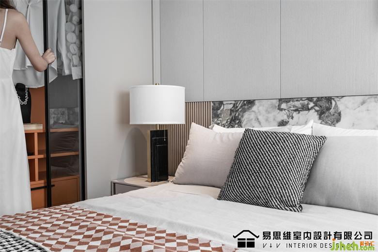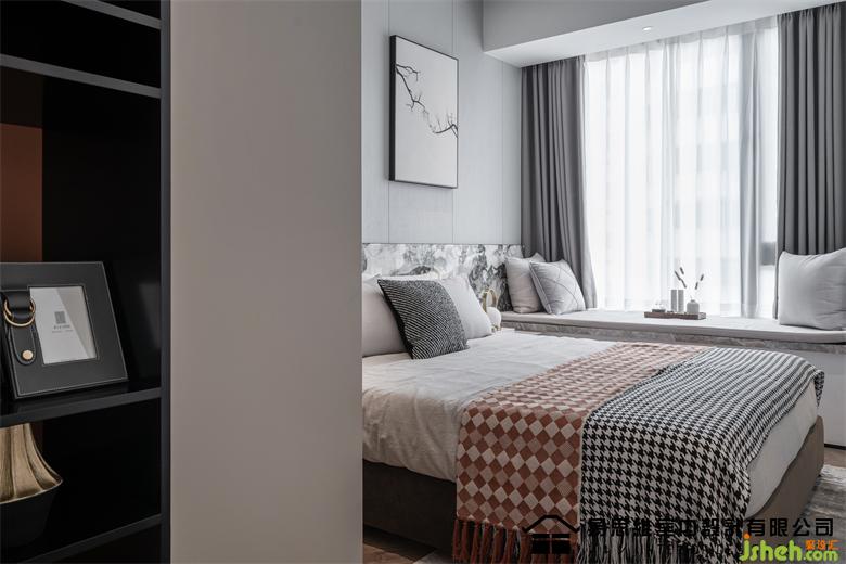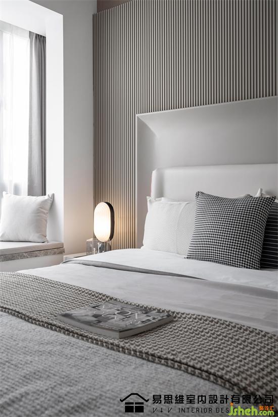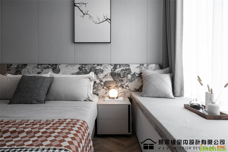 空間利用現(xiàn)下流行的墻面造型將視覺的注意力轉(zhuǎn)移在具有豐富圖案的石材紋理上,肌理表達(dá)出硬朗和干練的視覺,佛山家裝設(shè)計(jì)配合灰色調(diào)的床品、飄窗墊,傳達(dá)出穩(wěn)定安靜的情緒。