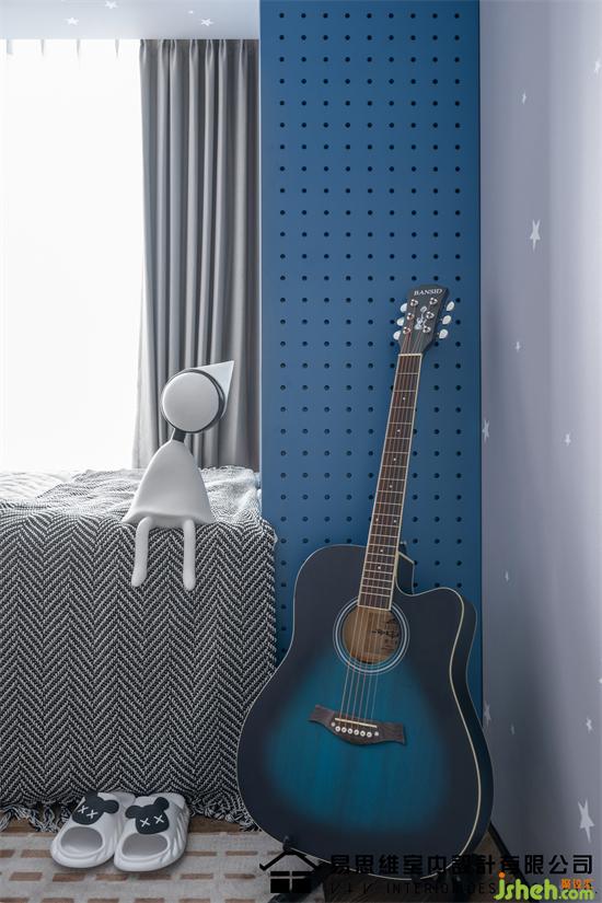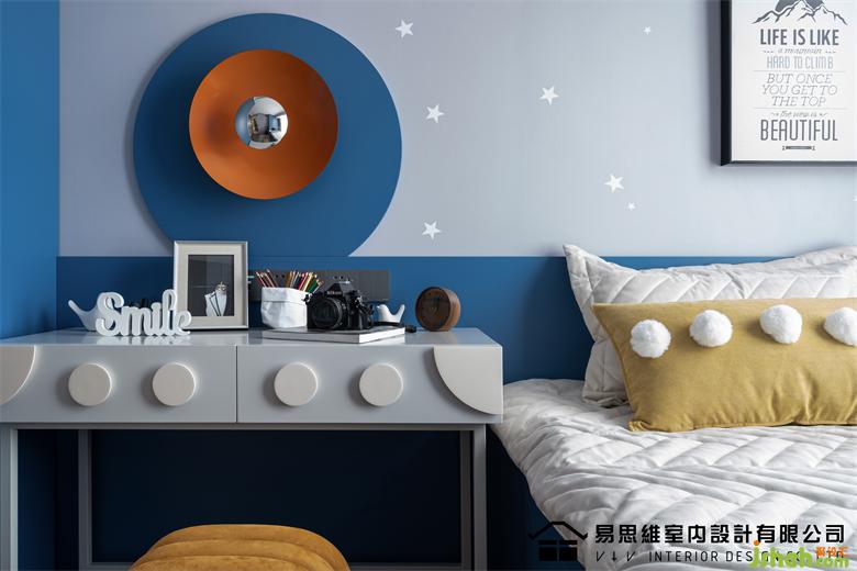 藍(lán)色作為空間的主流色,無形中賦予這個(gè)空間一種人格的屬性,這應(yīng)該是屬于愛做夢的少年,充滿童趣的空間催發(fā)著孩子的想象力。佛山家裝設(shè)計(jì)在大面積的藍(lán)色之中,融入淺色的灰藍(lán)調(diào)進(jìn)行色彩中和,形成對比且統(tǒng)一的視覺效果。亮眼的橙色仿照太陽的光芒賦予空間無限的創(chuàng)意以及對未來的期許。