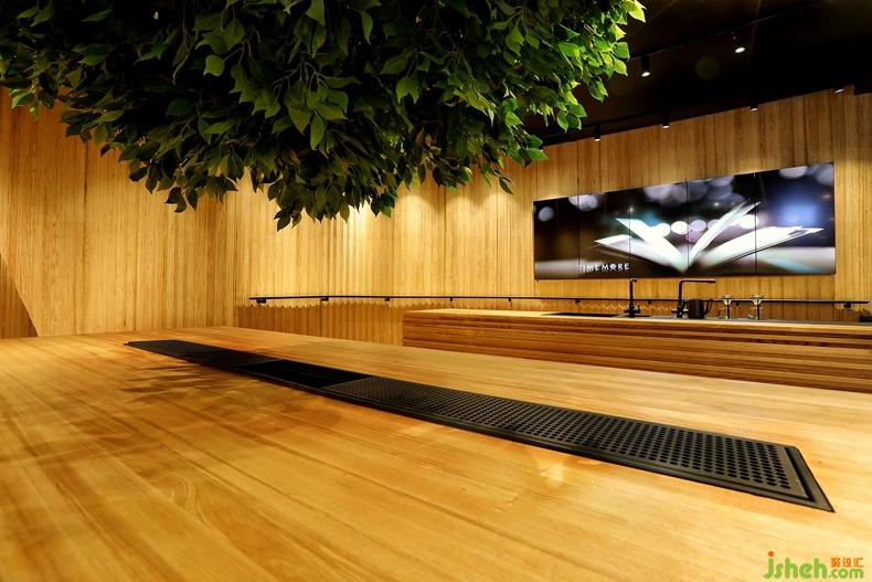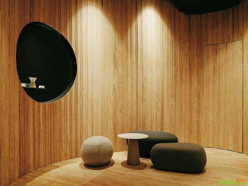 我們把這家店理解成一個(gè)關(guān)于“時(shí)間”的世界??Х榷故怯猩?,一杯咖啡的制作,研磨、萃取及每一個(gè)步驟都需要耐心和專注。這里也是一個(gè)安靜的世界,時(shí)間在這里靜靜的流淌,這個(gè)世界的組成要素里主要是木頭,時(shí)間凝結(jié)成的生命。一道金屬弧形展架在右側(cè)墻面順勢(shì)劃過,空間始終以二元方式展開,動(dòng)與靜、剛與柔、內(nèi)與外、正與反。這樣讓整個(gè)空間蘊(yùn)含某種張力。
