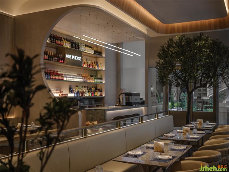 邁入門廳,內(nèi)部結(jié)構(gòu)功能分明,吧臺造型從天到地弧線連接,深圳俄式餐吧設(shè)計線條清晰的長凳沙發(fā)椅實現(xiàn)空間的柔性分割,最優(yōu)化降低空間局促感,吧臺區(qū)和用餐區(qū)自由轉(zhuǎn)換,既相互獨立,又和諧統(tǒng)一。