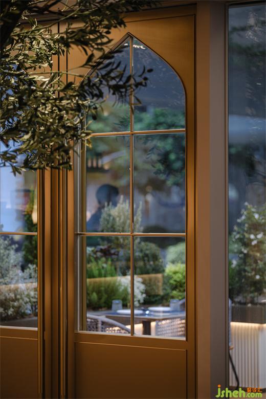 淺灰色半弧縱向條紋作為門頭的主體背景,與入口周圍的淺灰色裝飾墻面相得益彰,構(gòu)成了一種莫蘭迪色的高級感。俄羅斯建筑經(jīng)典“洋蔥頭”造型的金銅色玻璃門彰顯著尊貴和個性,簡單而不失精致的螺旋型壁燈點綴著優(yōu)雅和時尚。
