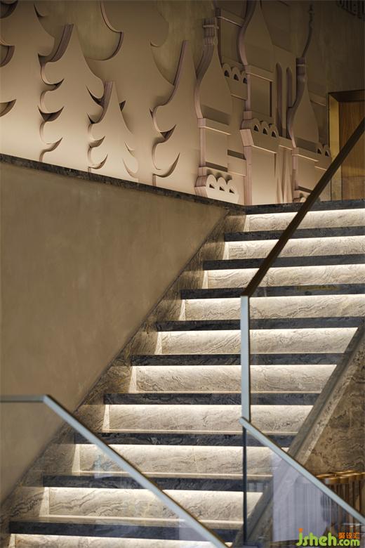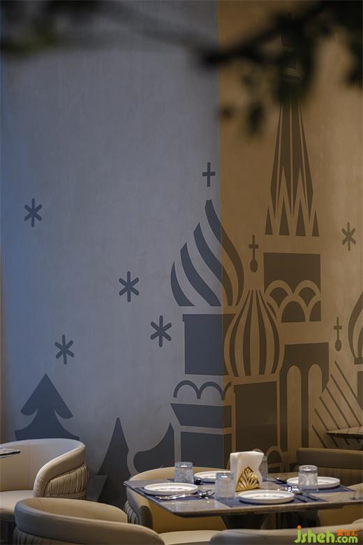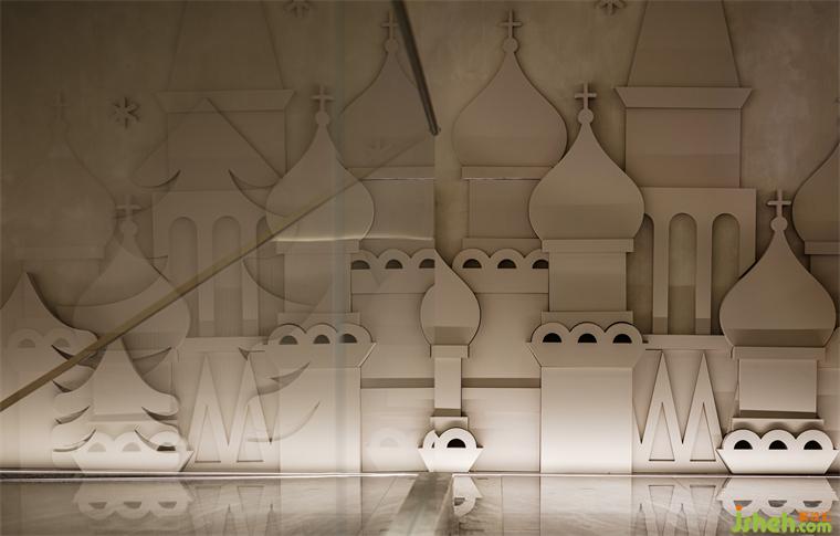 別出心裁的浮雕墻,處于空間每個(gè)角度的視野之內(nèi),正在降落的雪花、高低相間的松樹林、深圳俄式餐吧設(shè)計(jì)獨(dú)具一格的“洋蔥頭”教堂,在洗墻燈下生動(dòng)融合,設(shè)計(jì)師用精煉的語言標(biāo)示了羅格空間獨(dú)特的文化屬性。