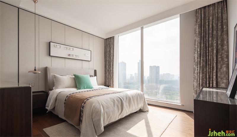 樣板房設(shè)計(jì)以儒雅平和的色彩、材質(zhì)容納主人的生活尺度,空間氛圍營造的任務(wù)更多交由室外光景的自然表達(dá),室內(nèi)物什在自然光的加持下氤氳出溫柔而感性的空間氣質(zhì)。