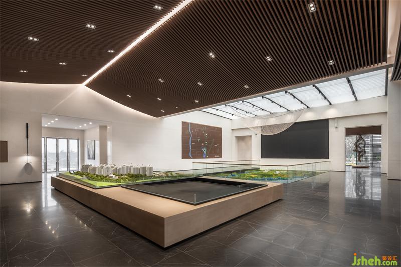 與自然邂逅,與山水相擁,與心靈對話,環(huán)球融創(chuàng)黑龍灘自然屬性便是如此。步入室內大廳,售樓處設計整體以黑龍灘的自然景觀為基調,從原木的形態(tài)中提取元素及色調,結合室內設計語言疊織交錯出自然平和的寫意環(huán)境。獨具肌理的石材在光影的照耀下形成片片漣漪,猶如在靜謐的湖面蕩起微波,自然之意呼之欲出。