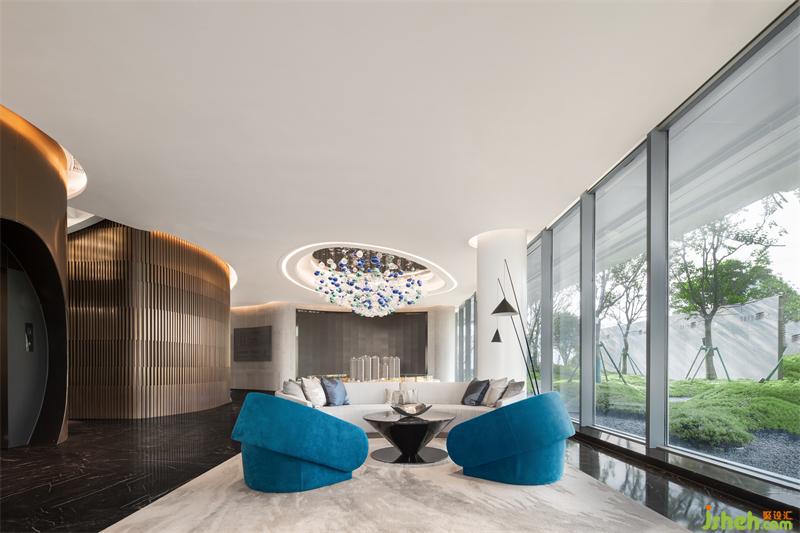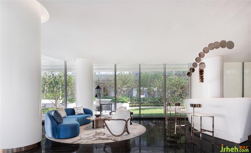 大自然賦予萬物變化的形體,湖水涌動仿佛要掙脫空間界定的桎梏。營銷中心設(shè)計運(yùn)用西方極簡繪畫手法將“百湖”的語言改編,轉(zhuǎn)化為藝術(shù)裝置的形態(tài),恰到好處地表現(xiàn)出空間的視覺張力。