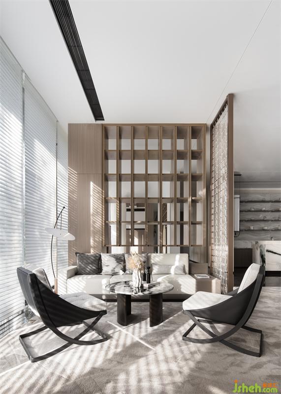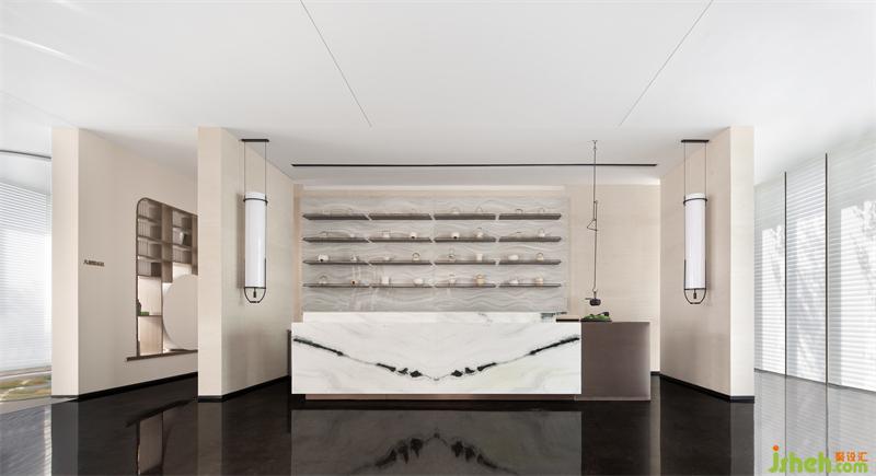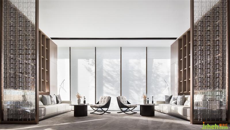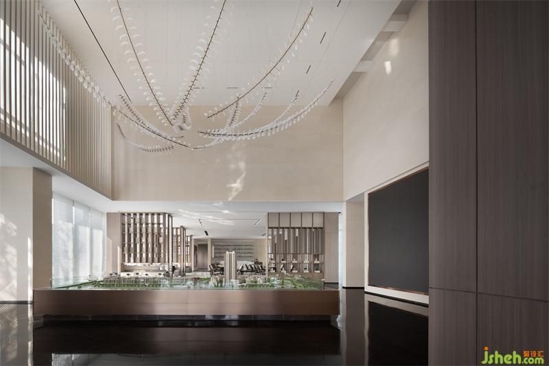同一空間中,銷售中心設(shè)計(jì)面料、木藝、金屬及石材等不同材料之間的碰撞,簡(jiǎn)明而克制。
