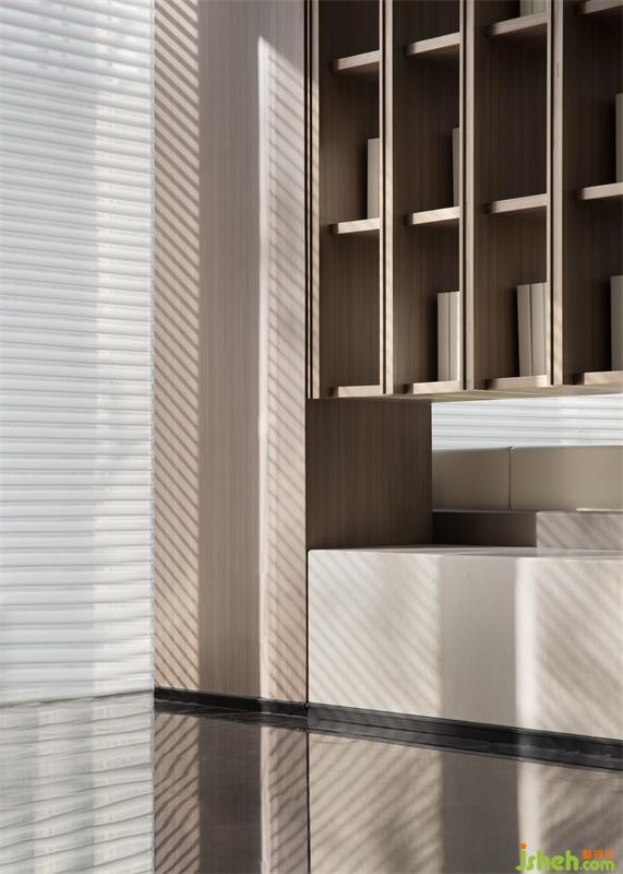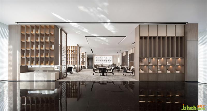 洽談區(qū)在開放的空間中進(jìn)行了疏落有秩的布局,線性成面的簡(jiǎn)易書架,將空間巧妙分割,如同置身于千年前的蘭臺(tái)書院之中,在若隱若現(xiàn)間,構(gòu)建時(shí)光的趣味與詩意。