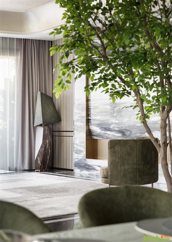 悠然步入客廳,色調(diào)的碰撞,線條的交錯,不同材質(zhì)之間組成了一幅令人眼前一亮的畫面。樣板房設(shè)計空間以白為主色,點綴些許橄欖綠。輕盈的窗簾、溫潤的木質(zhì)、雀躍的金屬、沉穩(wěn)的石材,在白色鋪陳的冷靜氛圍中,揮發(fā)出各自的物性。