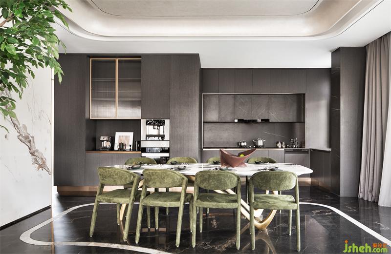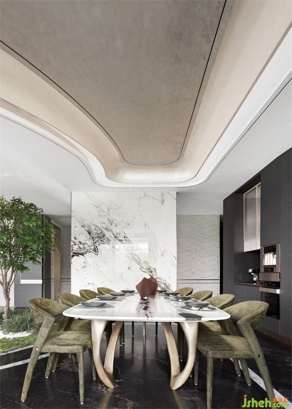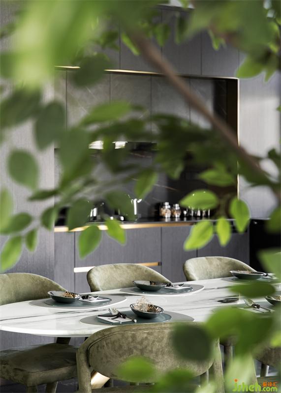 水墨溶于空間,客廳墻面的自由紋路向餐廳延伸,與大理石灰色桌面上的花紋呼應(yīng),樣板房設(shè)計在無序與有序之間,為素色清雅的空間帶來氣場,賦予了餐廳更沉穩(wěn)理性的基調(diào)。