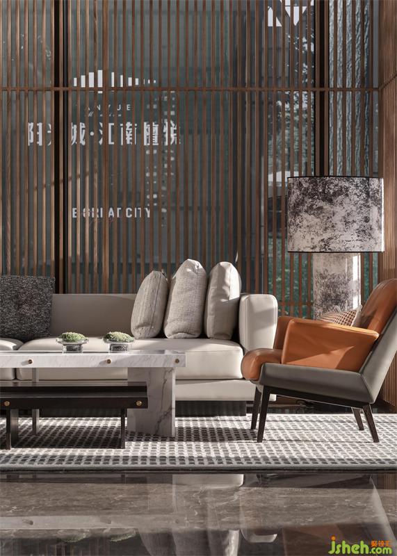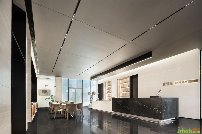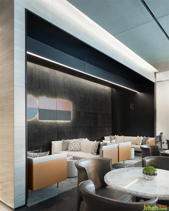 從接待區(qū)出發(fā),開(kāi)啟邕江文化之旅。潑墨大理石瓷磚地面和木紋石墻面從入口處延伸至內(nèi)部,頂面的軌道燈與造型線(xiàn)條燈如同城市軌道與橋梁橫梗其上,在藝術(shù)燈光與自然光影的交相輝映下,以多元視角觀照著來(lái)者內(nèi)心的精神共鳴。
