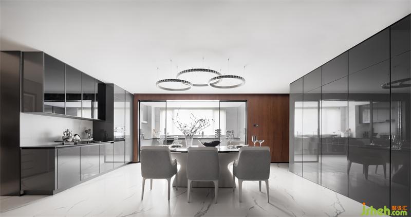 客廳在淺色調(diào)的鋪敘下,由內(nèi)向性的空間美學(xué)轉(zhuǎn)向一種開敞的非封閉狀態(tài),涵蓋了接人待客與居家共享的重要空間,整面落地窗削減了空間線條的硬朗,最大程度吸納室外舒朗景致,讓都市性格和自然情緒于此處有機(jī)結(jié)合。光影之下,流暢緊湊的生活動(dòng)線被巧妙引出,沒有過多贅述,一氣呵成。