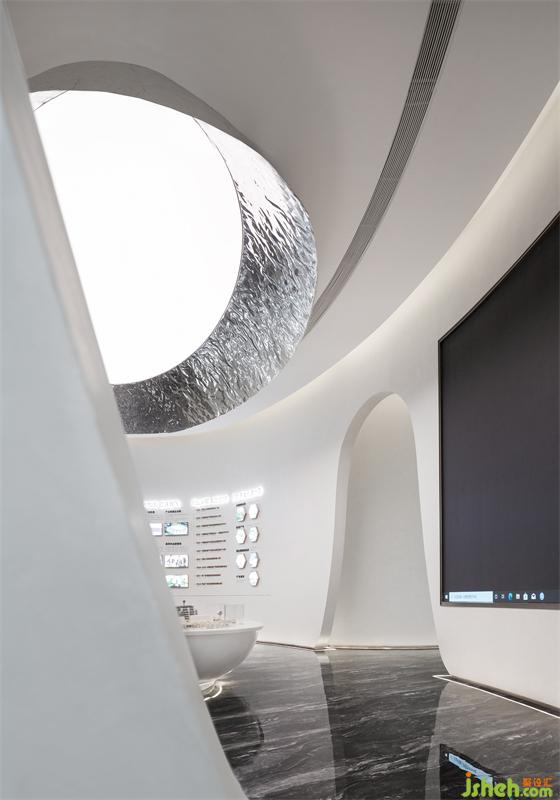 月的化形,水的意境,組成沙盤區(qū)藝術結構的弧度表征,柔和的光自上而下彌漫開來,如圓月在水面投射的倒影,暈出波紋般的流光。入口接待區(qū)四周灑落的點點星光,是自然意象與當代材質碰撞出的詩意,猶如洞中螢火蟲發(fā)出熒光,讓四周變得夢幻起來。