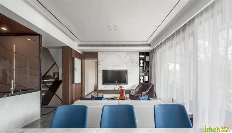 別墅裝飾在空間中觸發(fā)居者探索的意念。一條有方向的弧線彈跳在橫縱間的視覺感受中,借助光與影融合在整體的空間氛圍之內(nèi),平衡而充滿韻律。
