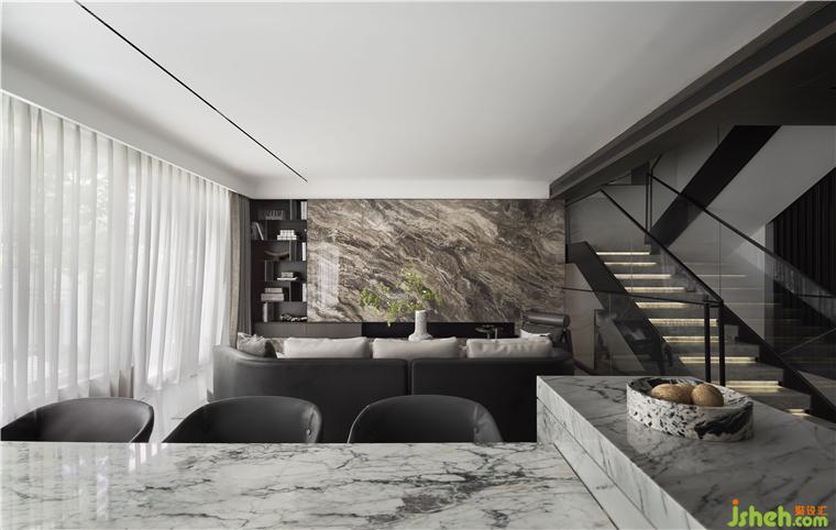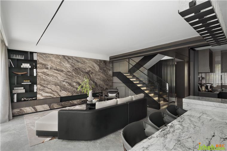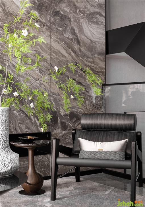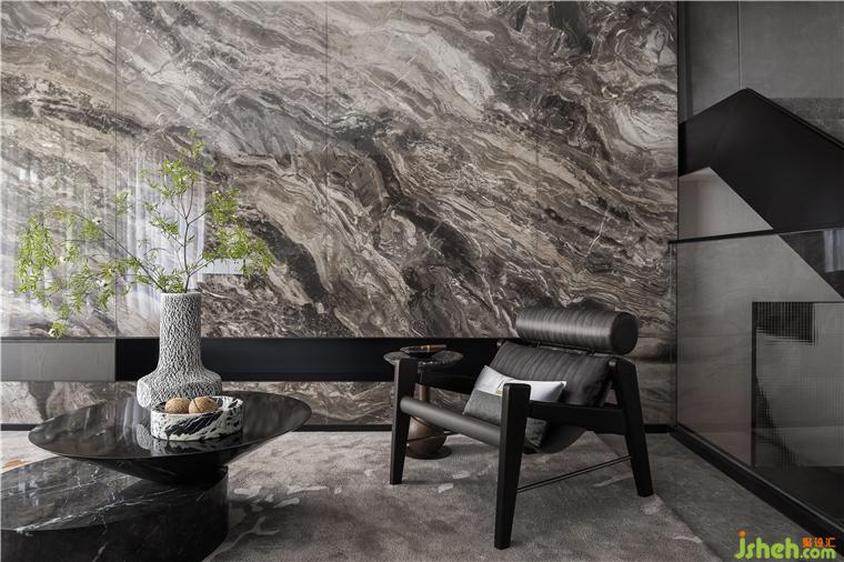 整體空間色彩以深淺不一的灰色系打造獨特氣質(zhì)??蛷d空間方正,天然大理石結(jié)晶出時間的浪漫,糅雜著金屬線條。樣板房設(shè)計在深色木紋飾面板的相互結(jié)合下,各種材質(zhì)以各司其職,引發(fā)了感官及精神層面對美的通感。