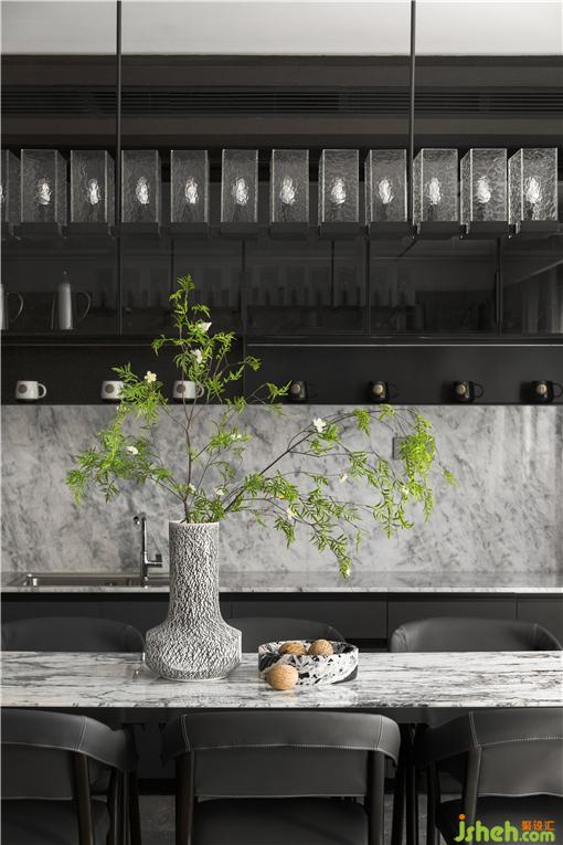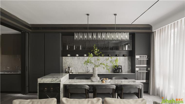 圓弧波浪元素吊頂與灰色木飾面融合,明暗互襯,對比鮮明,樣板房設(shè)計讓藝術(shù)與感性在不經(jīng)意間傳達至各處。在一餐又一餐的人生旅程中,感悟煙火人生。