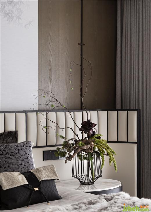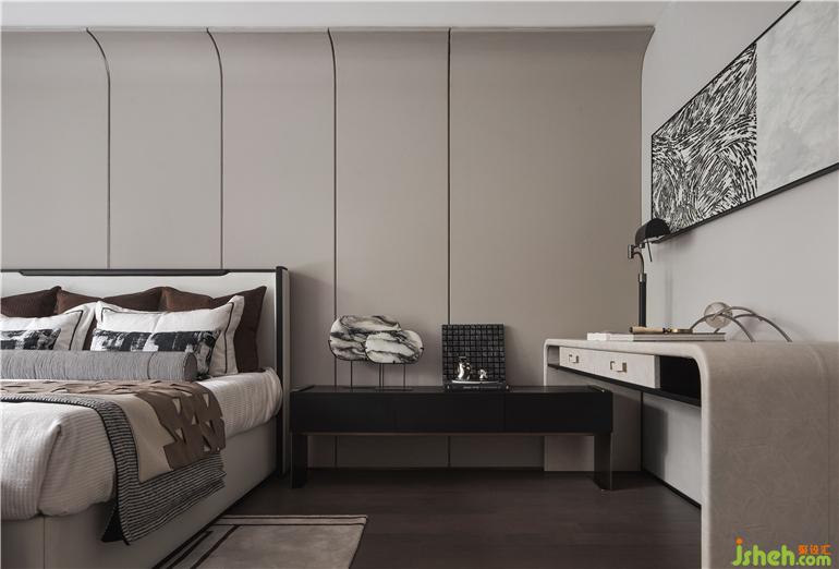 精細(xì)化的全齡化分區(qū)設(shè)計(jì),滿足了家庭三代人及客人來訪的不同需求。作為情感和心理需求的依托,樣板間設(shè)計(jì)極度克制的去弱化符號(hào)性的形式,主臥以溫潤(rùn)木質(zhì)色調(diào)為基底,增加了私域的溫度感。明與暗的顏色對(duì)比,線與形的造型顯現(xiàn),在光滑與柔軟的肌理碰撞下,平衡了視覺同時(shí)也予人心靈的共鳴。