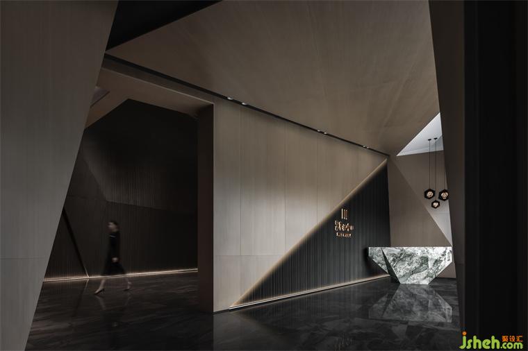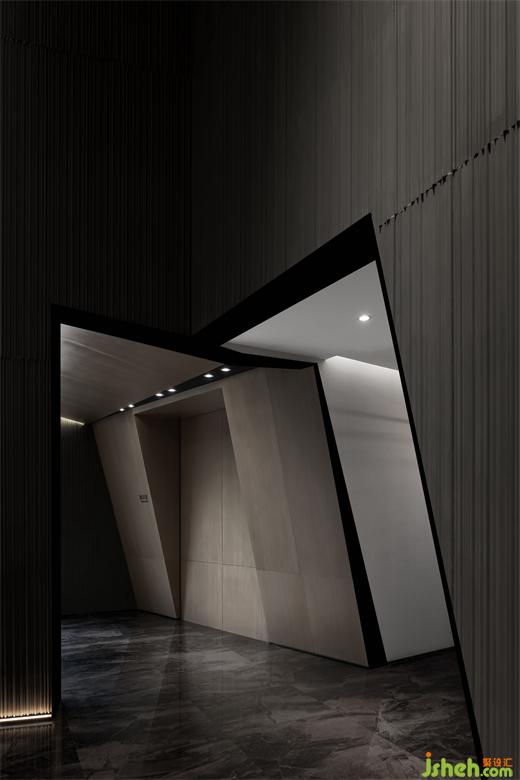 營(yíng)銷(xiāo)中心設(shè)計(jì)將星球的經(jīng)緯線(xiàn)抽象具體化,是設(shè)計(jì)藝術(shù)門(mén)廳的巧思。整個(gè)空間以星際宇宙為元素點(diǎn),在點(diǎn)、線(xiàn)、面及晶格線(xiàn)網(wǎng)的交錯(cuò)中,對(duì)空間進(jìn)行切割。宇宙孔洞的入口由錯(cuò)層的折面板塊構(gòu)成,通過(guò)尺度的變化,化身為自然曲線(xiàn)與幾何形體的想象性對(duì)話(huà)。