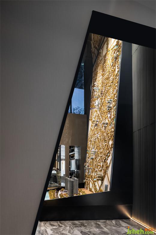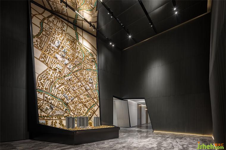 沙盤(pán)區(qū)設(shè)計(jì)靈感來(lái)自科幻片《盜夢(mèng)空間》,將錯(cuò)落的城市設(shè)計(jì)為一個(gè)多維度空間。不同于傳統(tǒng)沙盤(pán)設(shè)計(jì),銳度設(shè)計(jì)利用創(chuàng)新手法將沙盤(pán)符號(hào)進(jìn)行解構(gòu)、重組,于墻體之上形成一個(gè)卓然有趣的折疊拉伸,讓可視域范圍得到極大程度的延伸與拓展,營(yíng)銷(xiāo)中心設(shè)計(jì)構(gòu)建出時(shí)間與空間的無(wú)垠宇宙。右側(cè)屏幕墻模擬宇宙中不規(guī)則隕石的降落摩擦面,與沙盤(pán)形成某種陌生但是有趣的新能量,予人極具張力的夢(mèng)境懷想。