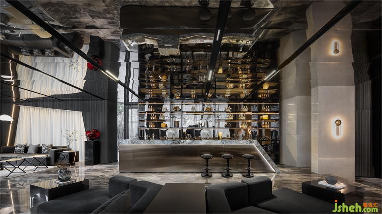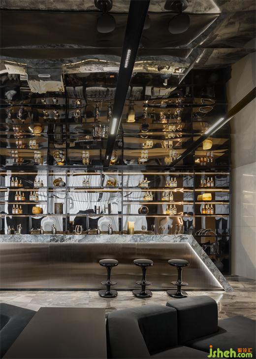 流動(dòng)的是宇宙和時(shí)光,使人在浩渺中漫游未來(lái)。水吧區(qū)將開(kāi)放性與包裹性相結(jié)合,利用空間流線(xiàn)型線(xiàn)條和地面金屬、石材、皮革、透明材質(zhì)相互呼應(yīng)共鳴,360度變幻沉浸式的感官體驗(yàn)。
