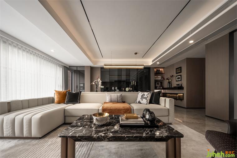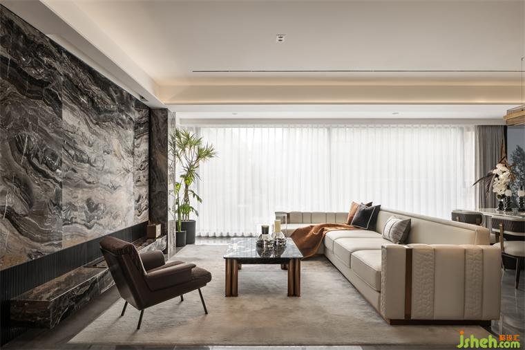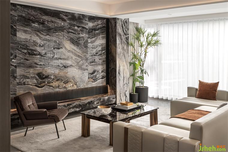 半環(huán)繞式的沙發(fā)隔絕了室外喧鬧,為空間帶來了更多的沉浸之感??蛷d的大理石墻面線條豐富但不繁瑣。四時(shí)的光影在石體上流轉(zhuǎn),金屬的堅(jiān)硬不羈、皮質(zhì)的原生觸感、玻璃的質(zhì)感光澤,各自保有個(gè)性又相得益彰,讓原本單一的空間被解構(gòu)為豐富變化的生活情境。