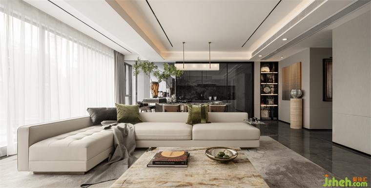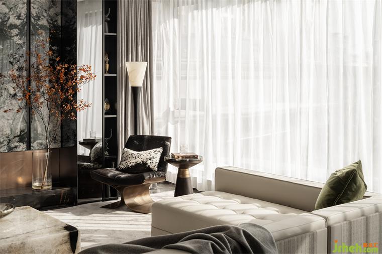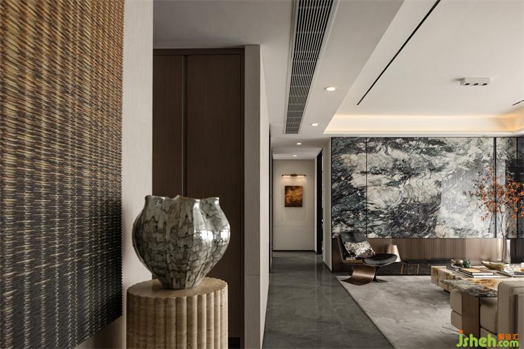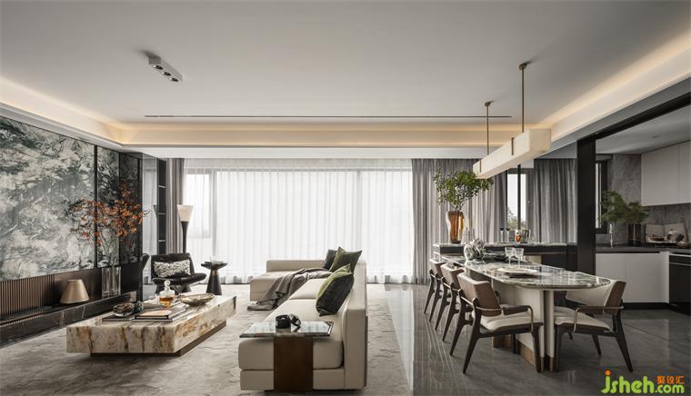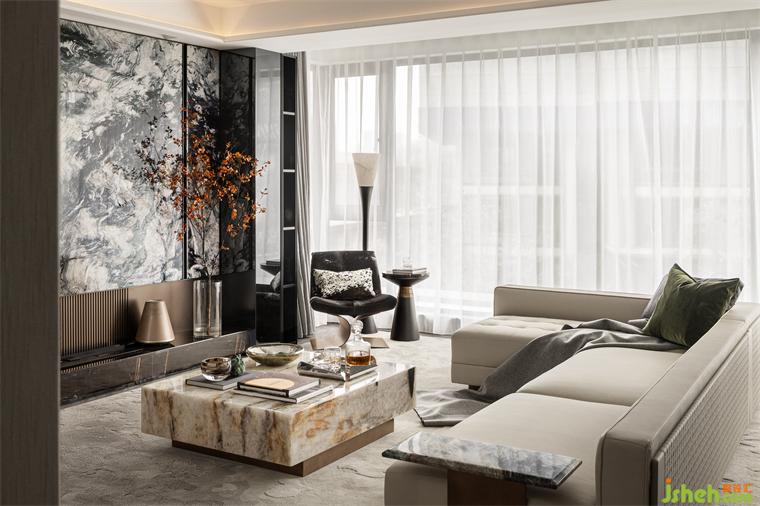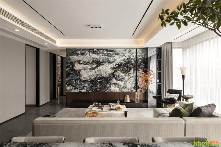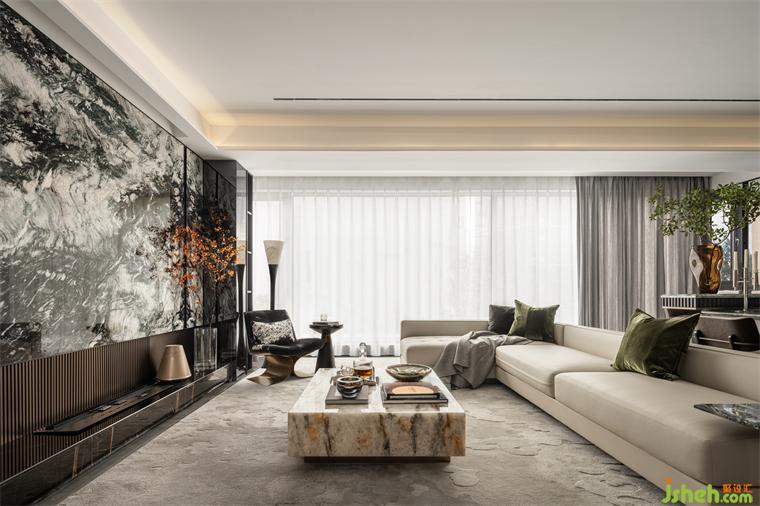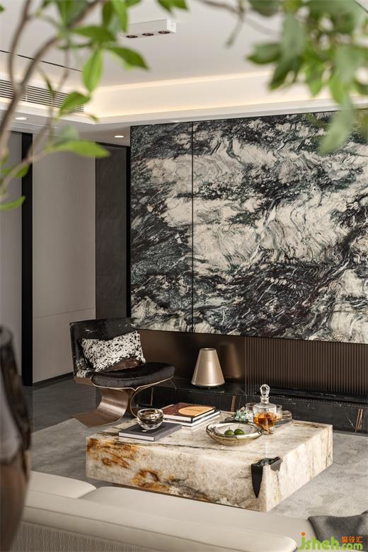 客廳生而自然的奢石將紋理的故事至于空間中,如浩渺的水墨云霧般,將傳統(tǒng)神韻與現(xiàn)代藝術(shù)巧妙的融合,生活的片段嵌入城市繁華之中。