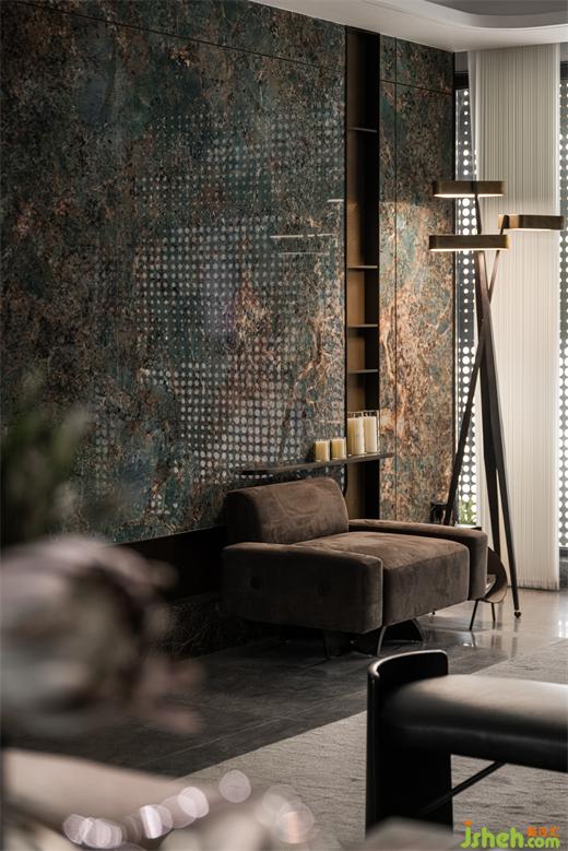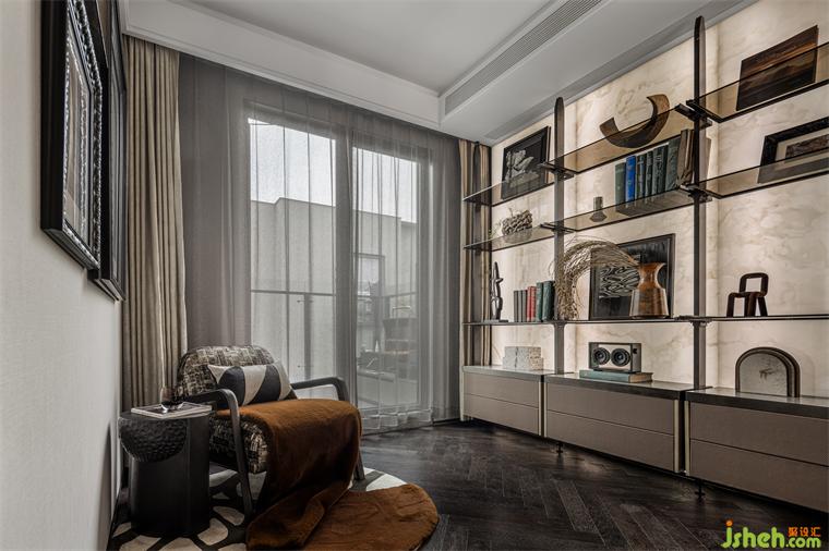 一側(cè)書房簡約沉穩(wěn),靠墻打造滿墻透光云石書架,別有一番意境。在這里,半卷閑書一壺?zé)岵?,將思緒置于書中,細(xì)品文字帶來的魅力。