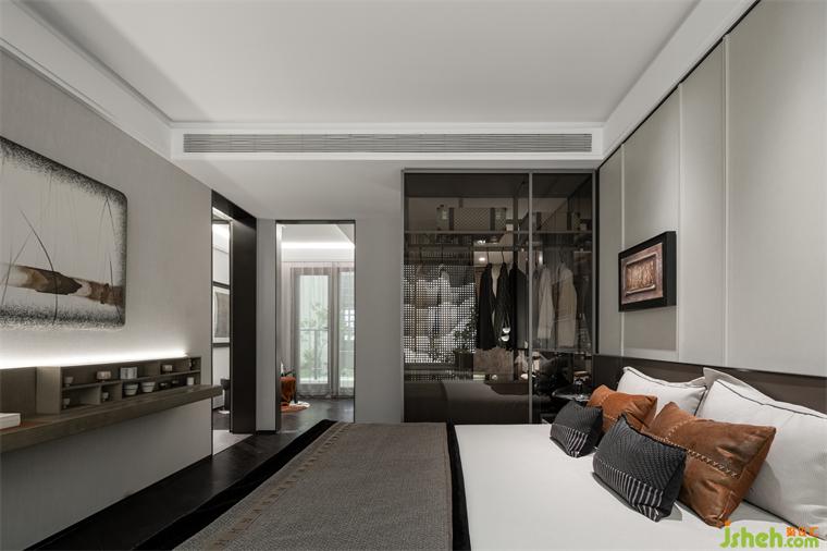 主人套房位于南向,擁有絕佳采光和通風(fēng)條件,集合獨立衣帽間與衛(wèi)浴系統(tǒng)等多種功能。樣板房設(shè)計以東方形塑當(dāng)代,讓雅意回歸,低飽和背景與深色床品搭配皮革,不設(shè)過分艷色,通過線條感的設(shè)計打造出流動的空間體驗,詩意,至此縈繞。