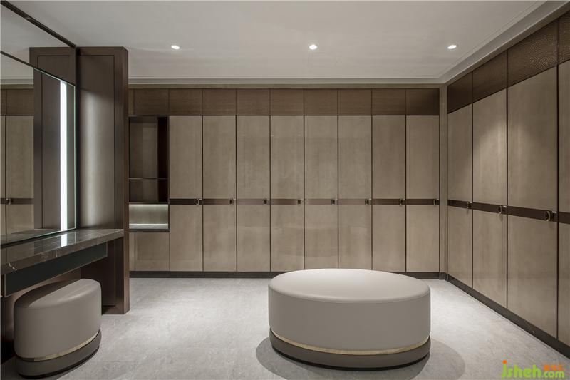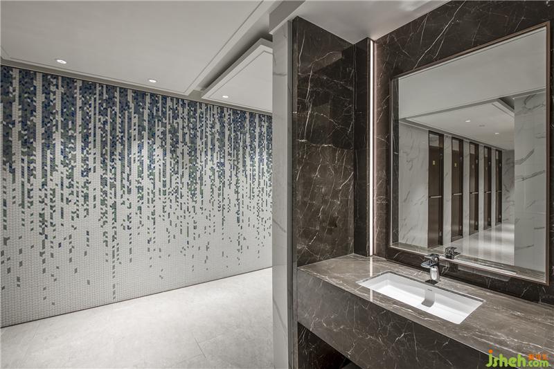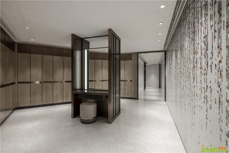 利用更衣柜定制的金屬凹凸板,拓展了空間的立體感,保證了私密性的同時消除了空間的逼仄感。整面馬賽克墻是裝飾上的亮點(diǎn),不僅與更衣室的主題氛圍相得益彰,更讓整體空間在中規(guī)中矩的布局中有了意識形態(tài)上的靈活變化。為照顧主觀感受和體驗,梳妝臺及臺盆都加設(shè)了條形燈光,凸顯了人性化的設(shè)計理念。